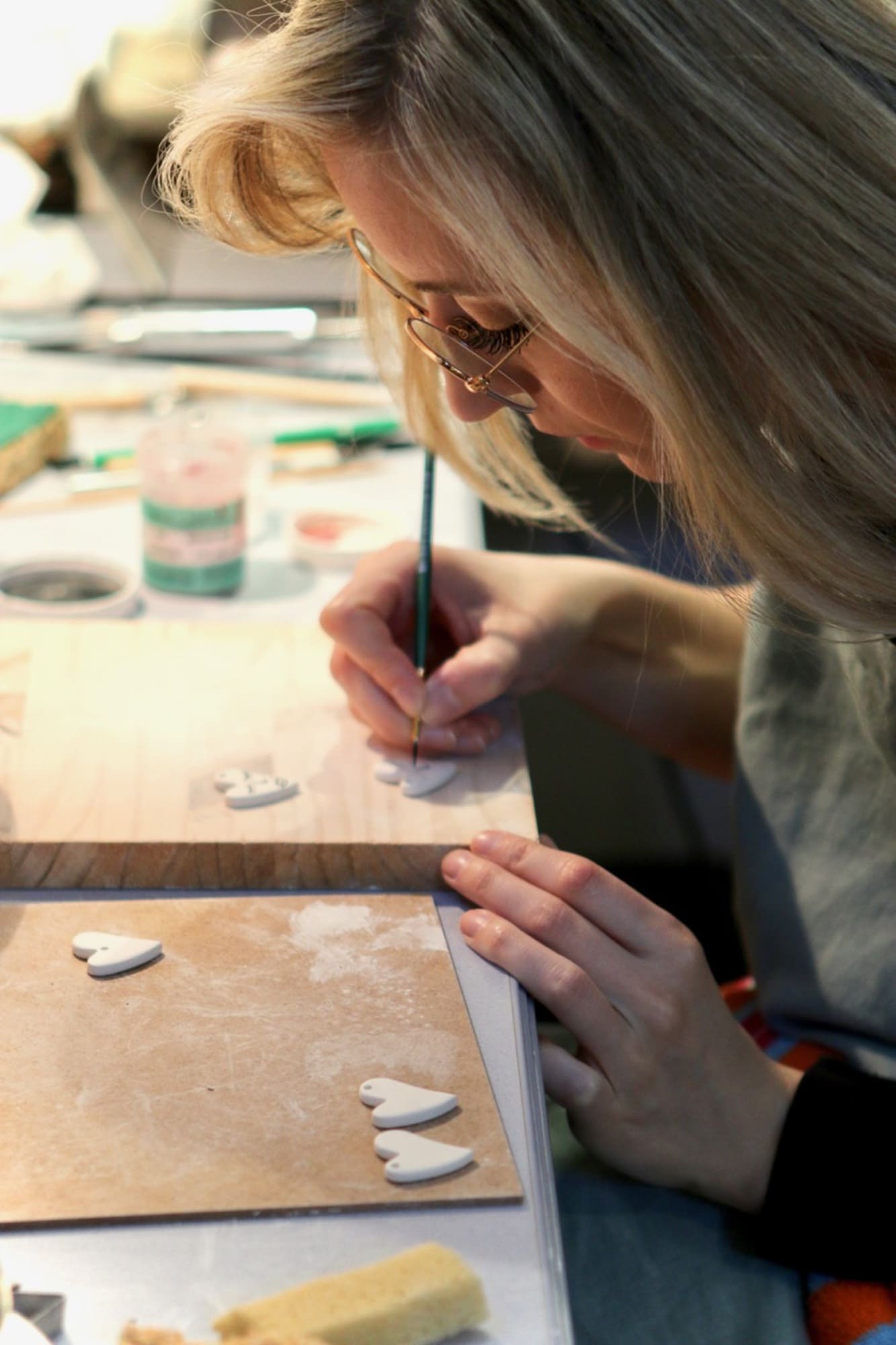 Certaines pièces possèdent un décor à l’or véritable. L’or s’applique à l’état liquide au pinceau, il ressemble alors à un caramel : plutôt épais et brunâtre. Il ne livrera son rendu final qu’après une troisième cuisson, à plus basse température (afin que le métal ne brûle pas). En plus du coût de ce métal précieux, cuire une troisième fois un objet constitue un risque supplémentaire de casse mais également des frais additionnels, c’est pourquoi les pièces porteuses d’or peuvent devenir plus onéreuses.