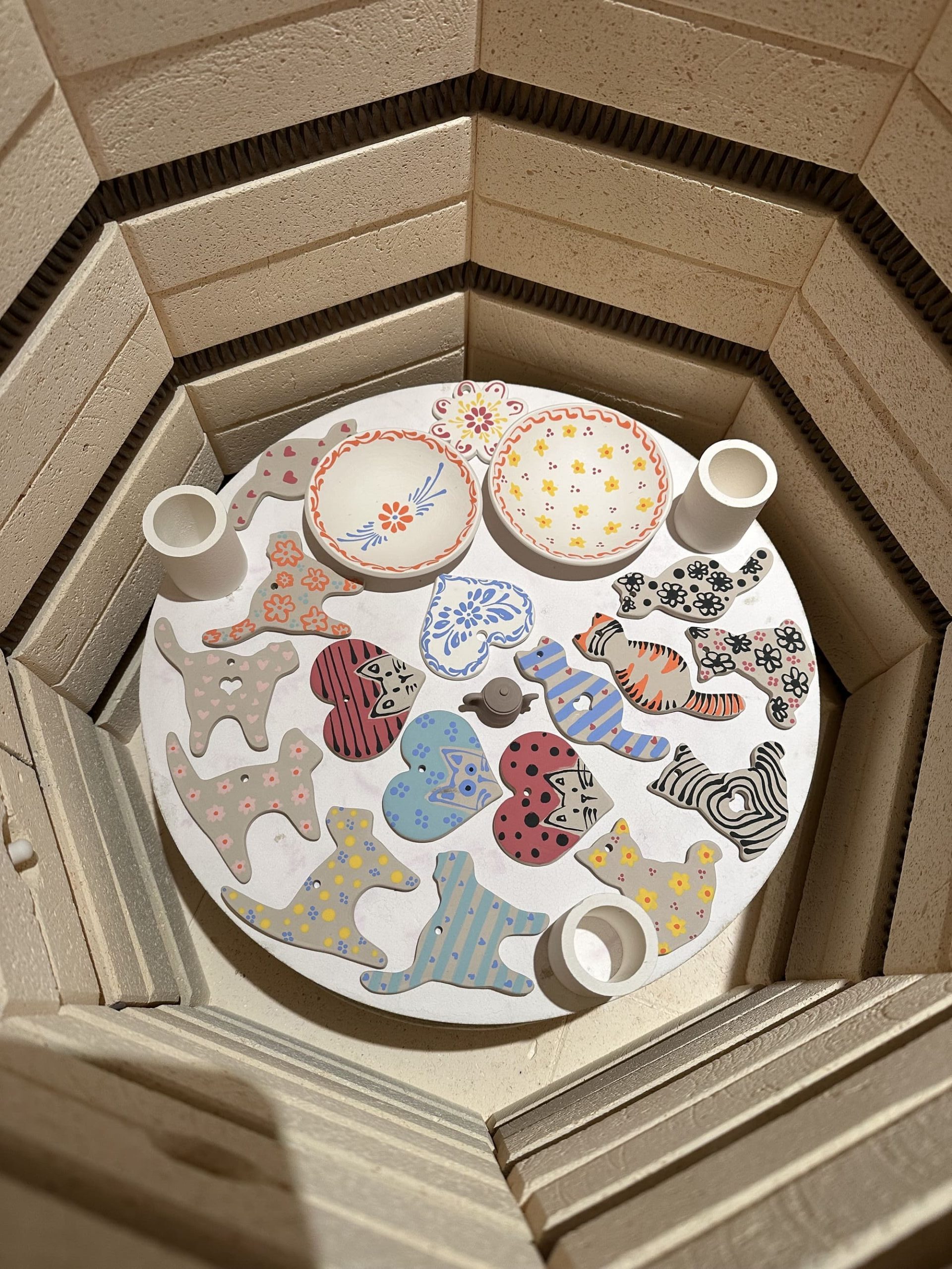 Je travaille essentiellement des terres dites de haute température, ce qui signifie qu'elle cuisent entre 1250 et 1300 degrés Celsius. Pour cela, j'utilise un four électrique. Chaque pièce est cuite au minimum deux fois, voire trois quand elle possède un décor à l'or.